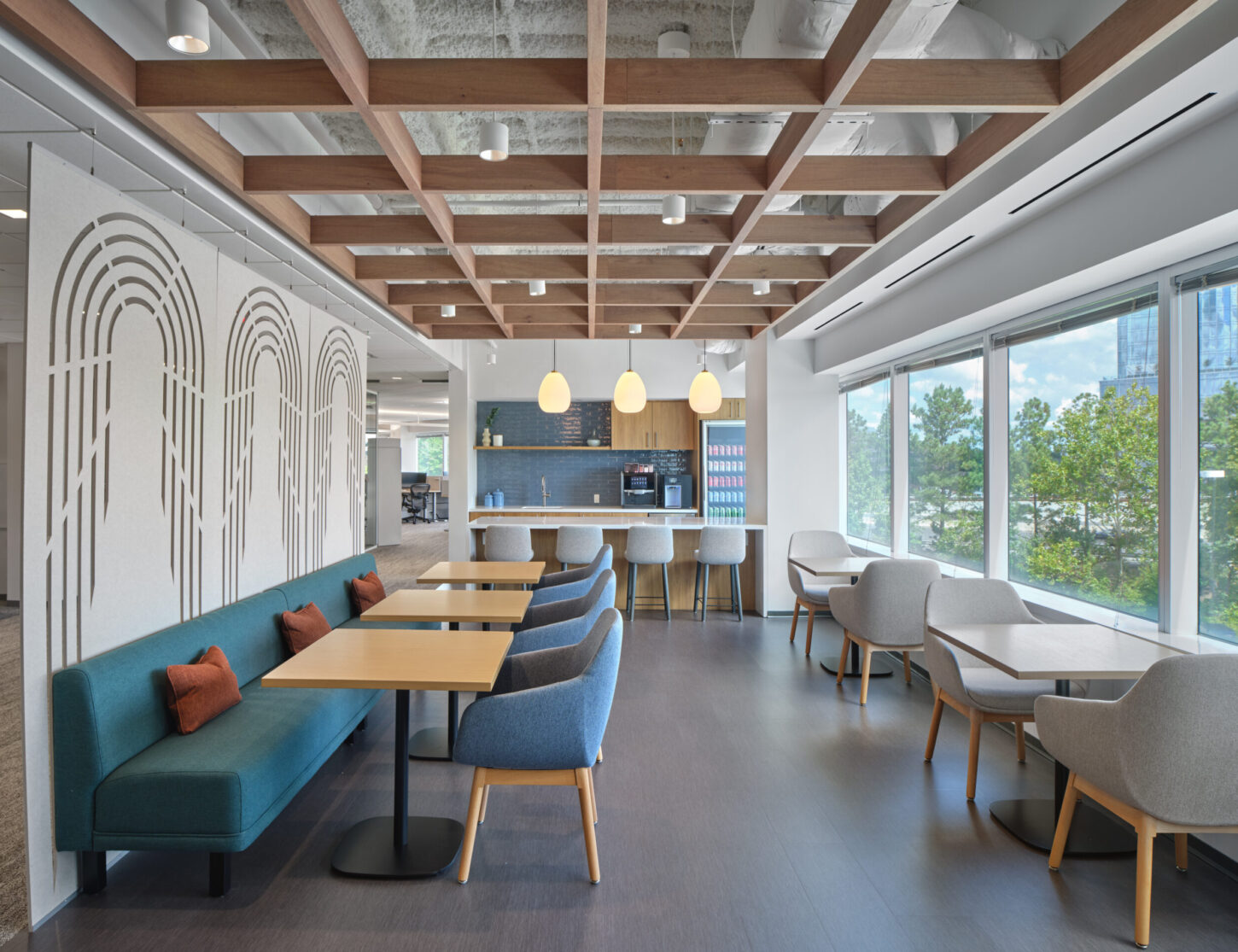 Key design elements include a distinctive turf ceiling feature and fabric screen dividers that add texture while defining zones throughout the suite. The project also incorporated multiple phone booths, requiring detailed coordination to route sprinkler lines and integrate life safety systems alongside owner-provided vendor components.